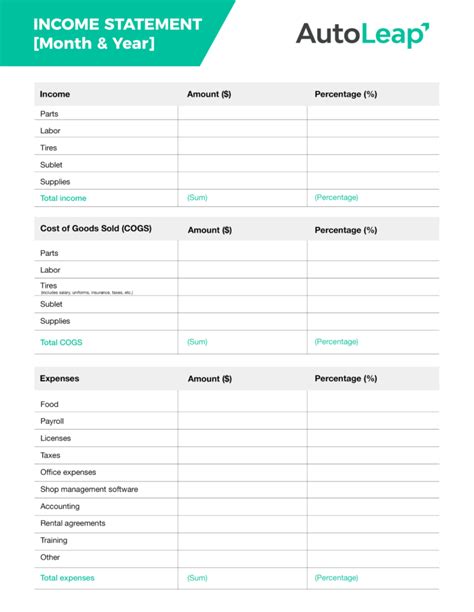 Auto Repair Shop Profit And Loss Statement